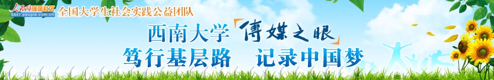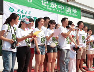 西南大學(xué)“傳媒之眼”社會實(shí)踐隊由新聞傳媒學(xué)院團(tuán)委老師李海峰、范曦帶隊,8名研究生、19名本科生組成。團(tuán)隊圍繞“篤行基層路,記錄中國夢”的主題,自7月3日開始,從建設(shè)生態(tài)北碚、“百姓中國夢”主題宣講、“幸福重慶”人文記錄、“山城百姓”社會調(diào)查四個方面開展活動。團(tuán)隊已經(jīng)在歇馬鎮(zhèn)碚青路中心廣場舉行了文藝匯演,并給群眾帶來了各種各樣的避暑藥品;到歇馬污水處理廠,了解當(dāng)?shù)厣a(chǎn)生活污水的處理;到重慶歇馬機(jī)械曲軸有限公司,宣傳“節(jié)能生產(chǎn)”理念,在員工中開展環(huán)保培訓(xùn),強(qiáng)調(diào)可持續(xù)生產(chǎn)和發(fā)展。