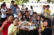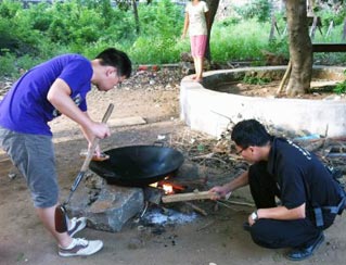 在三教村,志愿者受到了當(dāng)年解放軍進(jìn)城的待遇。由于小學(xué)在施工不便住宿,村民便打開自家新裝修的房子請(qǐng)隊(duì)員們住。接著隊(duì)員們到露天廚房大展身手,灶臺(tái)是由幾個(gè)石頭和一個(gè)大鐵鍋搭建而成。指導(dǎo)老師看大家興致高,也過來起火,燒柴。有天傍晚,烏云密布,眼瞅著雨就要掉下來,為了能讓志愿者們下雨前吃到飯,熱心的村民為志愿者們買醬料,給他們燒起了飯。