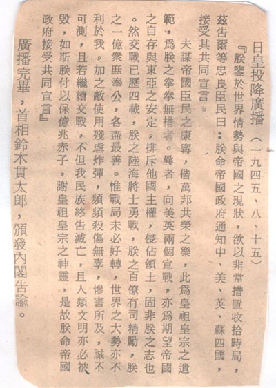 1945年8月15日日本天皇投降廣播詞。這篇文告是告訴自己的老百姓(忠良臣民)的。其中對(duì)于發(fā)動(dòng)戰(zhàn)爭(zhēng)的罪責(zé)不但沒(méi)有一個(gè)字的自責(zé),而且指“敵使用殘虐炸彈,頻頻殺傷無(wú)辜,慘害所及,誠(chéng)不可測(cè)。”和十余年后所發(fā)現(xiàn)的東條英機(jī)遺囑的惡劣態(tài)度如出一轍。廣大網(wǎng)友不放回頭看看2013年12月12日18:21:31《歷史鐵證日本400年侵華野心,讓我們恨搗靖國(guó)神社內(nèi)幕吧!》一文中東條英機(jī)的遺囑。
