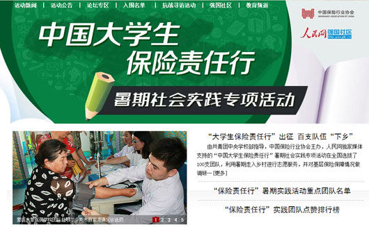 本次活動從全國27個省市100多所高校選拔出100支入圍團(tuán)隊,在暑期分別以支教、環(huán)保、醫(yī)療、調(diào)研等形式服務(wù)鄉(xiāng)村,提高當(dāng)?shù)鼐用癜踩庾R,提升社會對安全教育問題的關(guān)注,同時開展調(diào)研,了解基層保險保障相關(guān)情況。各團(tuán)隊實踐期間在人民網(wǎng)強(qiáng)國社區(qū)活動專區(qū)實時播報實踐進(jìn)程,發(fā)回稿件數(shù)千篇。大學(xué)生們積極走入社會、服務(wù)基層的實際行動贏得50萬網(wǎng)友為他們“點贊”。