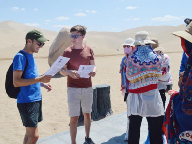 在敦煌的鳴沙山與月牙泉,兩名英國劍橋大學(xué)的大學(xué)生對“一帶一路”和“絲綢之路”概念的熟知程度令團(tuán)隊(duì)成員十分驚訝,外國青年對中國的文化歷史的濃厚興趣也令交流采訪十分順利和有趣。