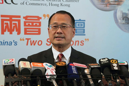 蔡冠深在香港中華總商會舉辦的“解讀全國兩會論壇”上接受采訪
