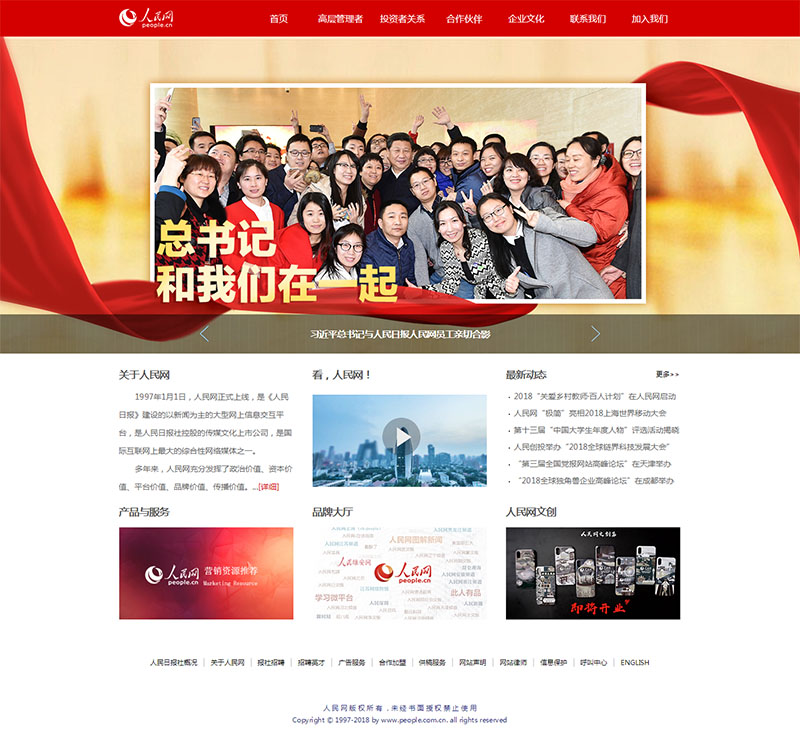 改版后,內(nèi)容呈現(xiàn)上既有人民網(wǎng)實(shí)力的全面展示,也突顯了上市公司的專(zhuān)業(yè)化形象。為了便于網(wǎng)友“零距離接觸”人民網(wǎng),頁(yè)面主展示區(qū)劃分成“關(guān)于人民網(wǎng)”“看,人民網(wǎng)!”“最新動(dòng)態(tài)”“產(chǎn)品與服務(wù)”“品牌大廳”“人民網(wǎng)文創(chuàng)”六大塊區(qū)域,內(nèi)容重點(diǎn)突出,直觀醒目。