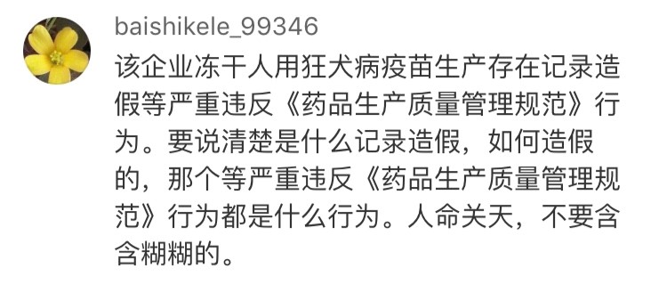 網(wǎng)友“baishikele_99346”認為:“要說清楚是什么記錄造假,如何造假的,那個等嚴重違反《藥品生產(chǎn)質(zhì)量管理規(guī)范》行為的都是什么行為。人命關(guān)天,不要含含糊糊!