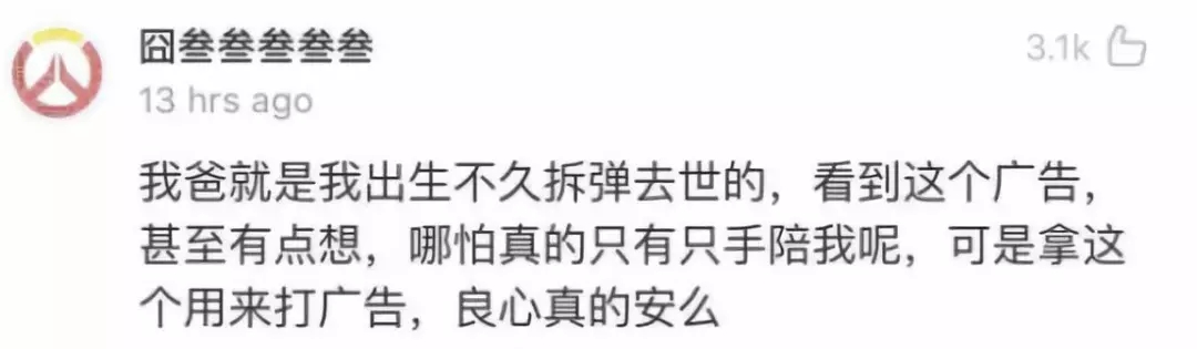 @囧叁叁叁叁叁:我爸就是我出生不久拆彈去世的,看到這個廣告,甚至有點(diǎn)想,哪怕真的只有只手陪我呢,可是拿這個來打廣告,良心真的安么?