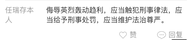 強(qiáng)國論壇網(wǎng)友“任瑞存本人”:侮辱英烈轟動趨利,實(shí)屬惡意踐踏正義,須要受到法治懲戒,須要接受道德警示。