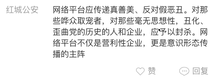 網(wǎng)友“紅城公安”:網(wǎng)絡(luò)平臺不僅是營利性企業(yè),更是意識形態(tài)傳播的主陣地,應(yīng)拿出基本責(zé)任感,傳播國家和民族的優(yōu)秀文化傳統(tǒng)。