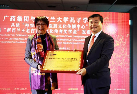 廣藥集團向奧克蘭大學孔子學院授予“神農草堂中醫(yī)藥文化傳播中心”牌匾,寓意雙方將共同推廣中醫(yī)藥文化