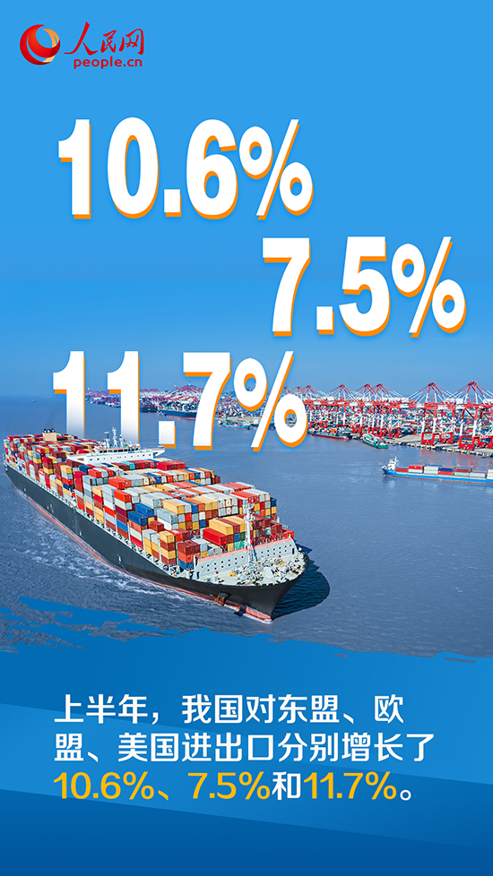 上半年,我國對東盟、歐盟、美國進(jìn)出口分別增長了10.6%、7.5%和11.7%。同期,我國對“一帶一路”沿線國家、區(qū)域全面經(jīng)濟(jì)伙伴關(guān)系協(xié)定(RCEP)貿(mào)易伙伴進(jìn)出口分別增長17.8%和5.6%。